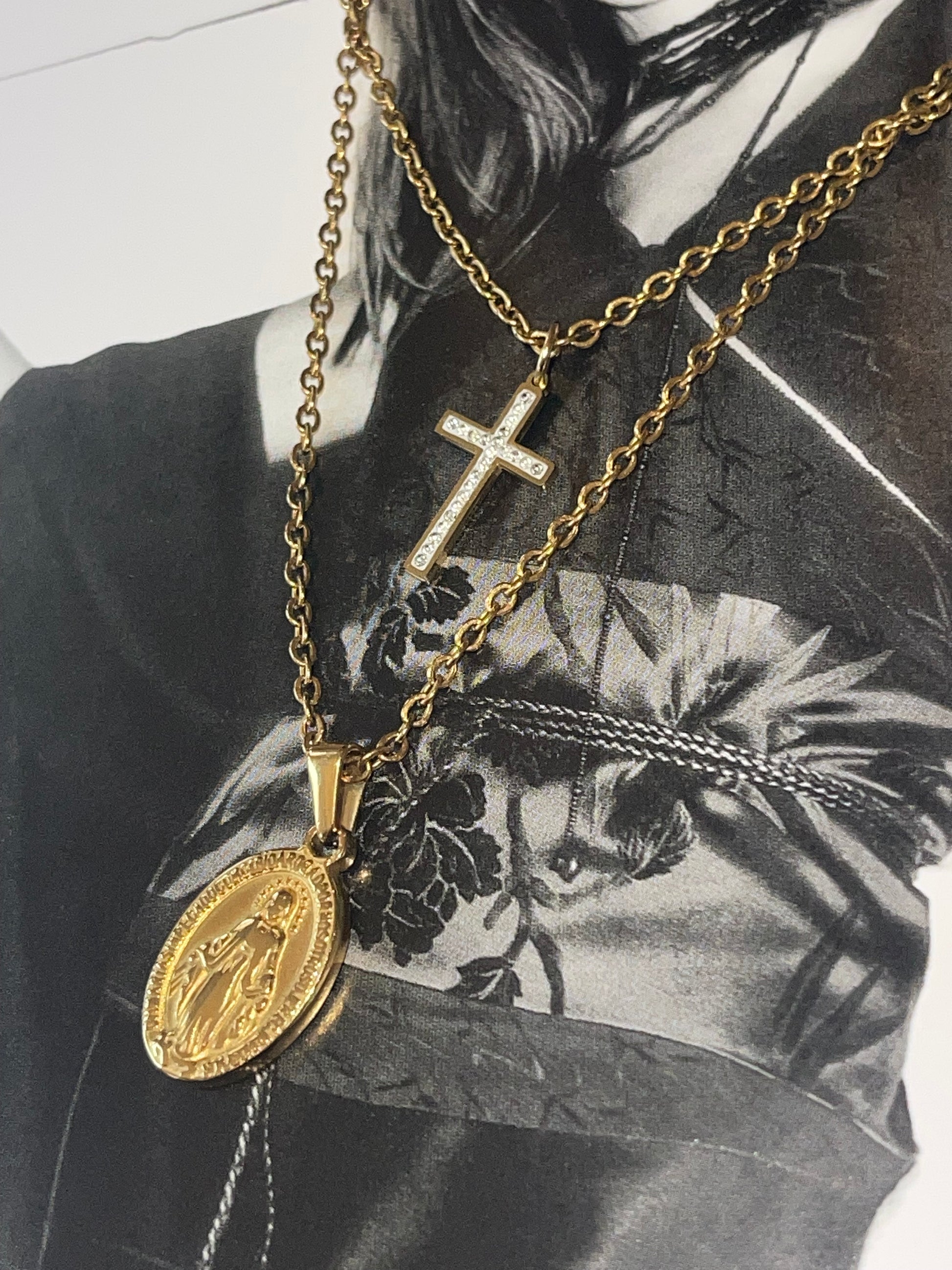 A layered devotion to Our Lady and the Cross this necklace features a CZ-encrusted crucifix and the Miraculous Medal, honoring Mary’s intercession and Christ’s sacrifice. A radiant reminder of faith, worn close to the heart.